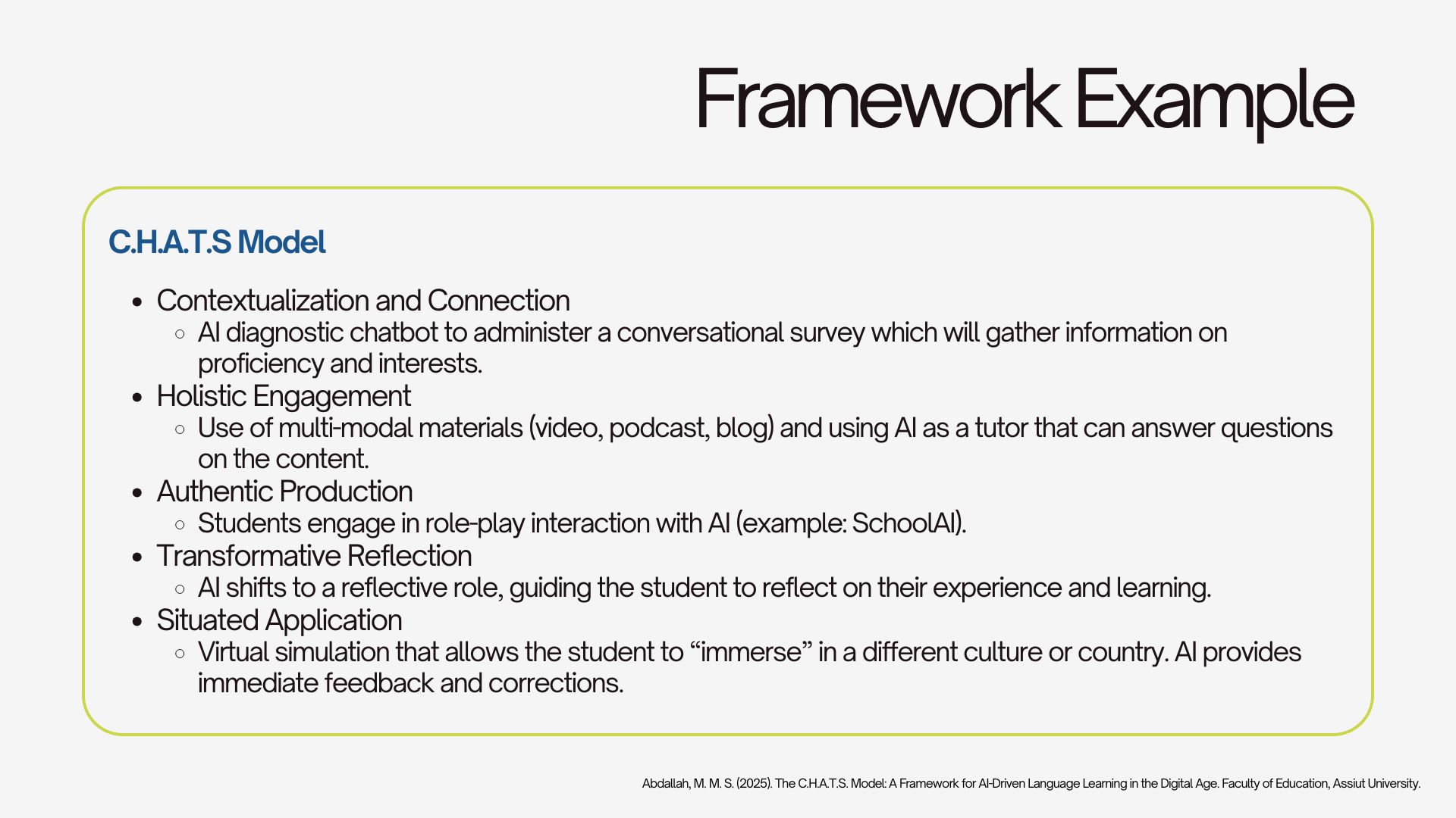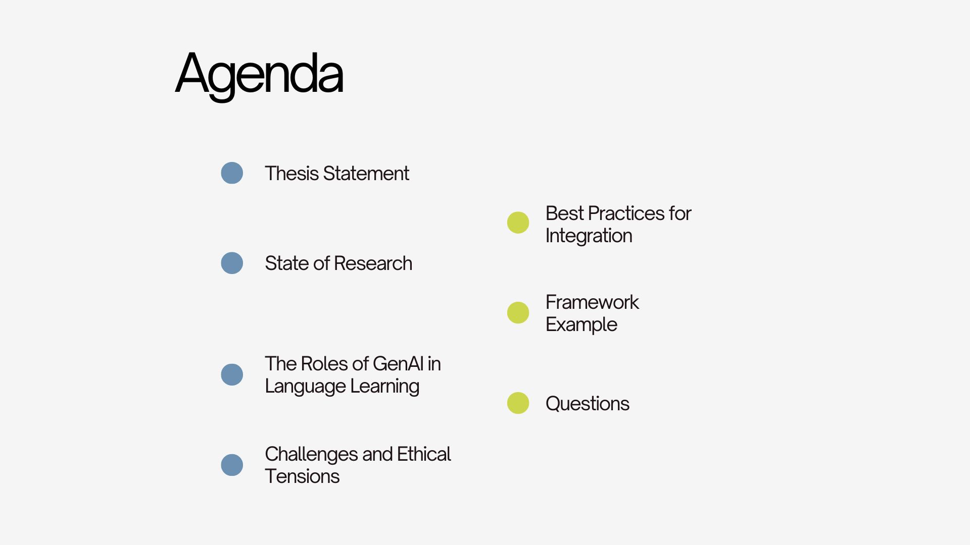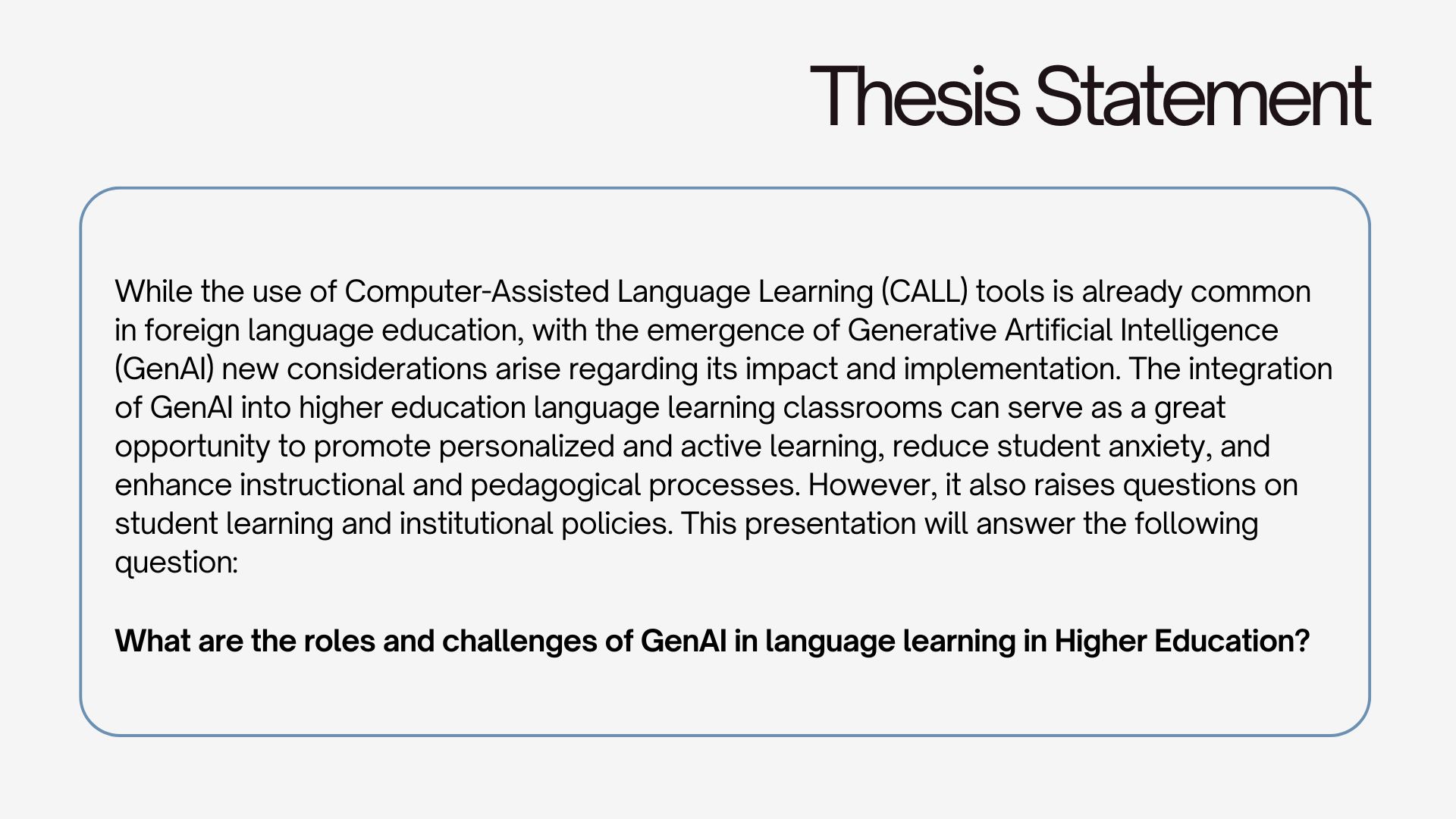 This presentation explores the use of GenAI in Language Learning course Higher Education. It covers the state of research regarding this topic, the roles that GenAI can take in the classroom, the challenges and ethical tensions, and the best practices for integration.