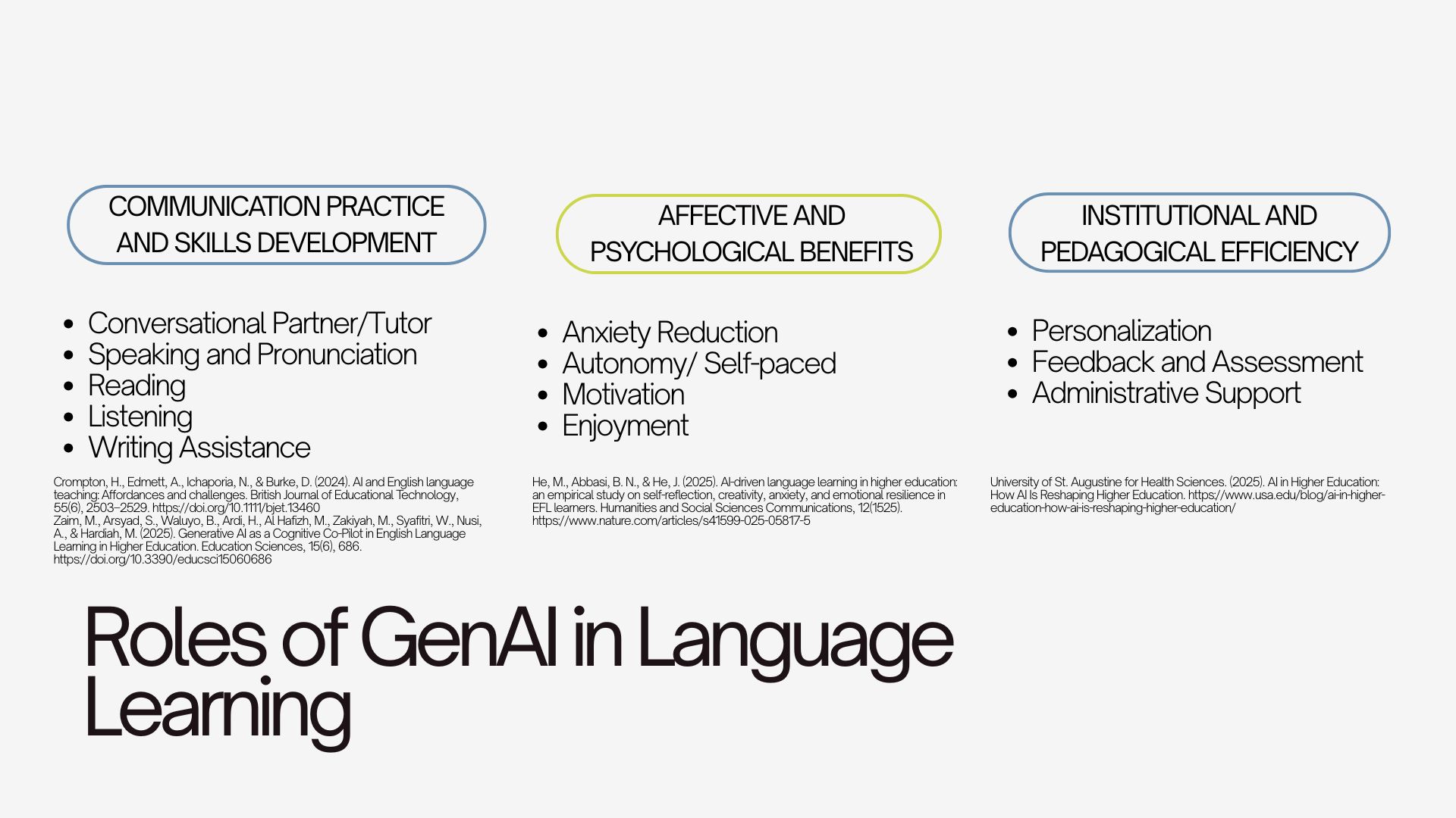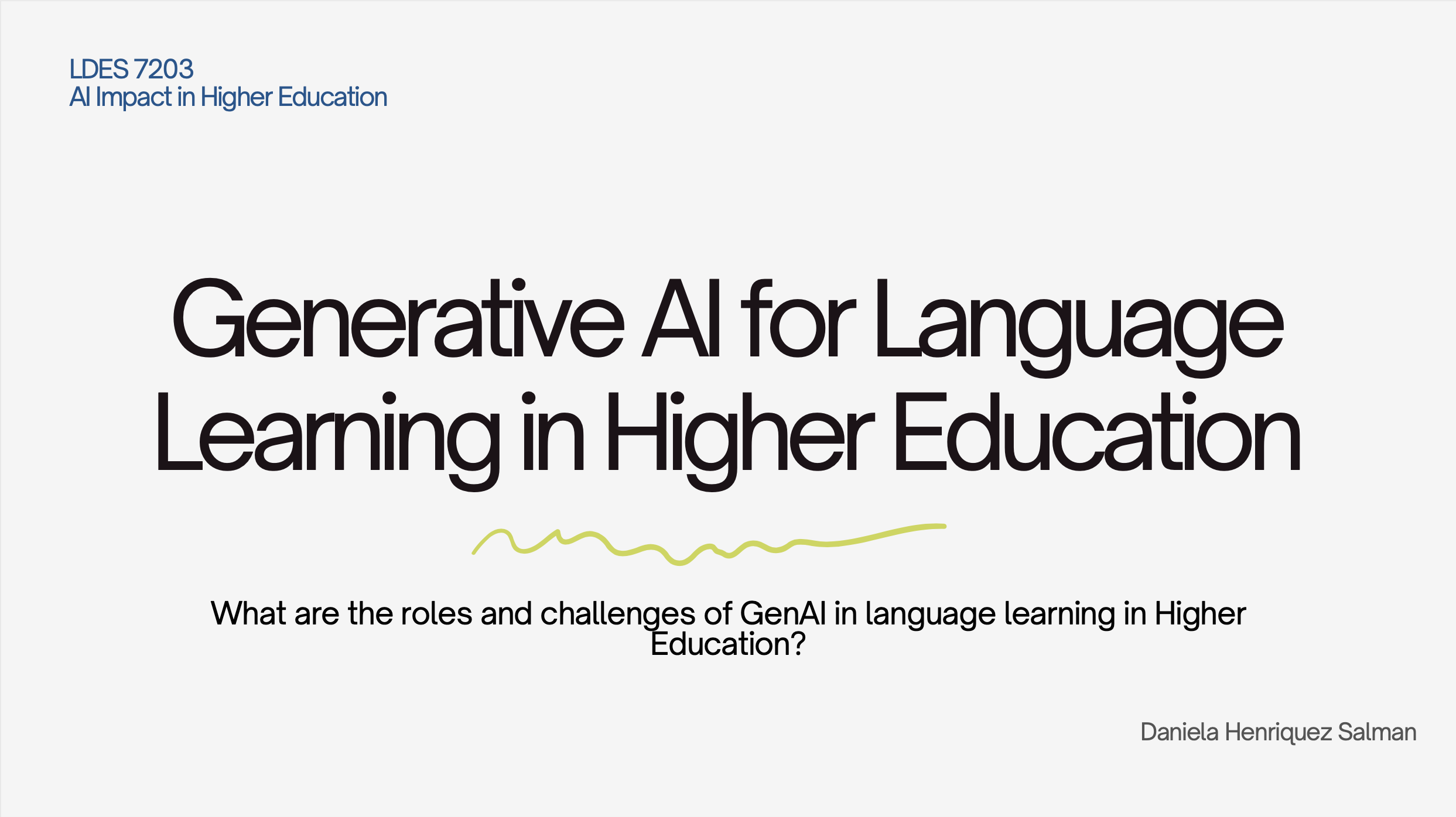 This presentation explores the use of GenAI in Language Learning courses in Higher Education. It covers the state of research regarding this topic, the roles that GenAI can take in the classroom, the challenges and ethical tensions, and the best practices for integration.