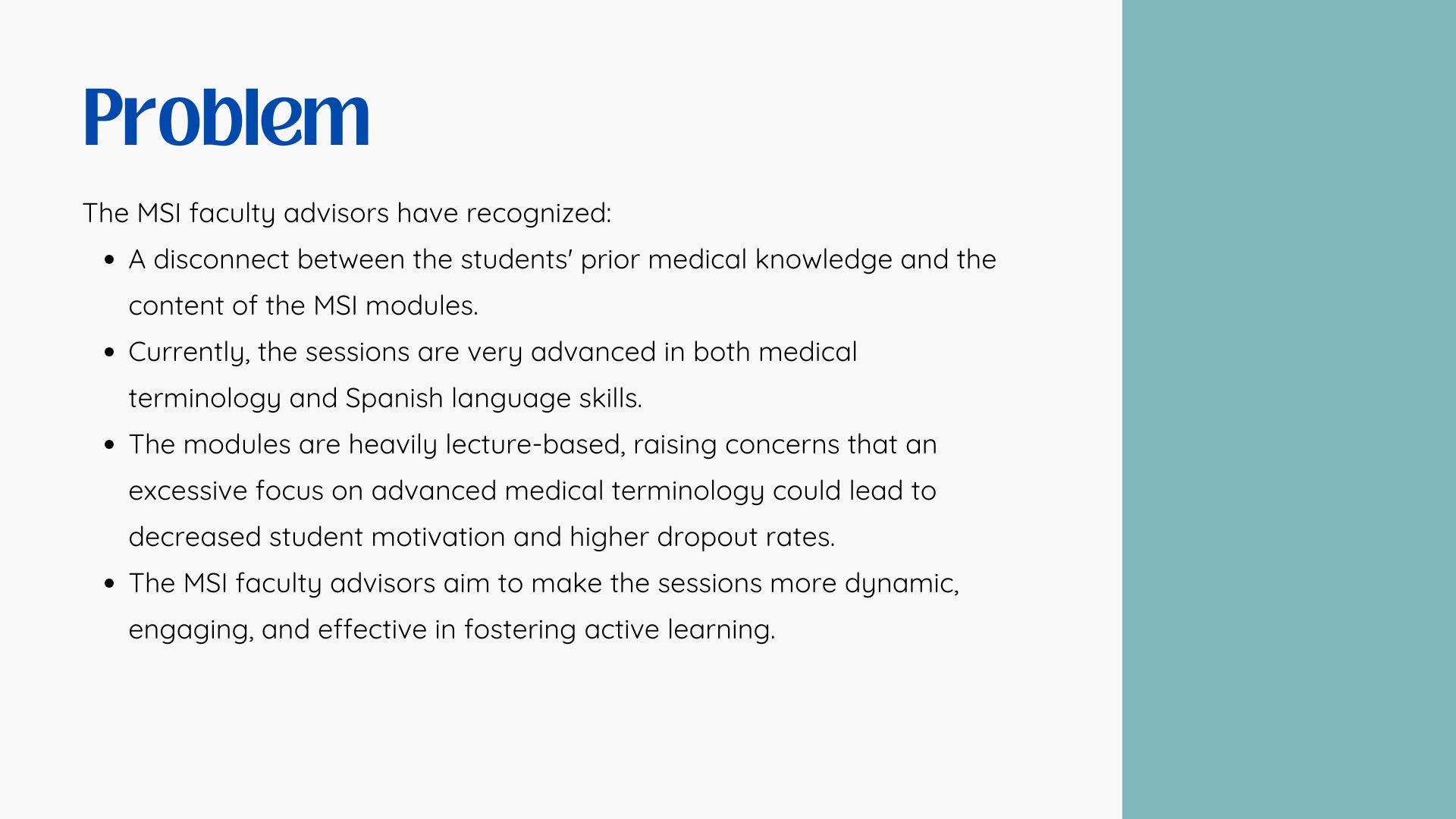 Recognizing a critical disconnect between existing student knowledge and the current MSI modules, faculty advisors have identified that the sessions are currently structured with disproportionately advanced medical terminology and linguistic requirements. This heavy reliance on lecture-based delivery has raised concerns that the cognitive load may discourage students, potentially leading to decreased motivation and higher dropout rates.