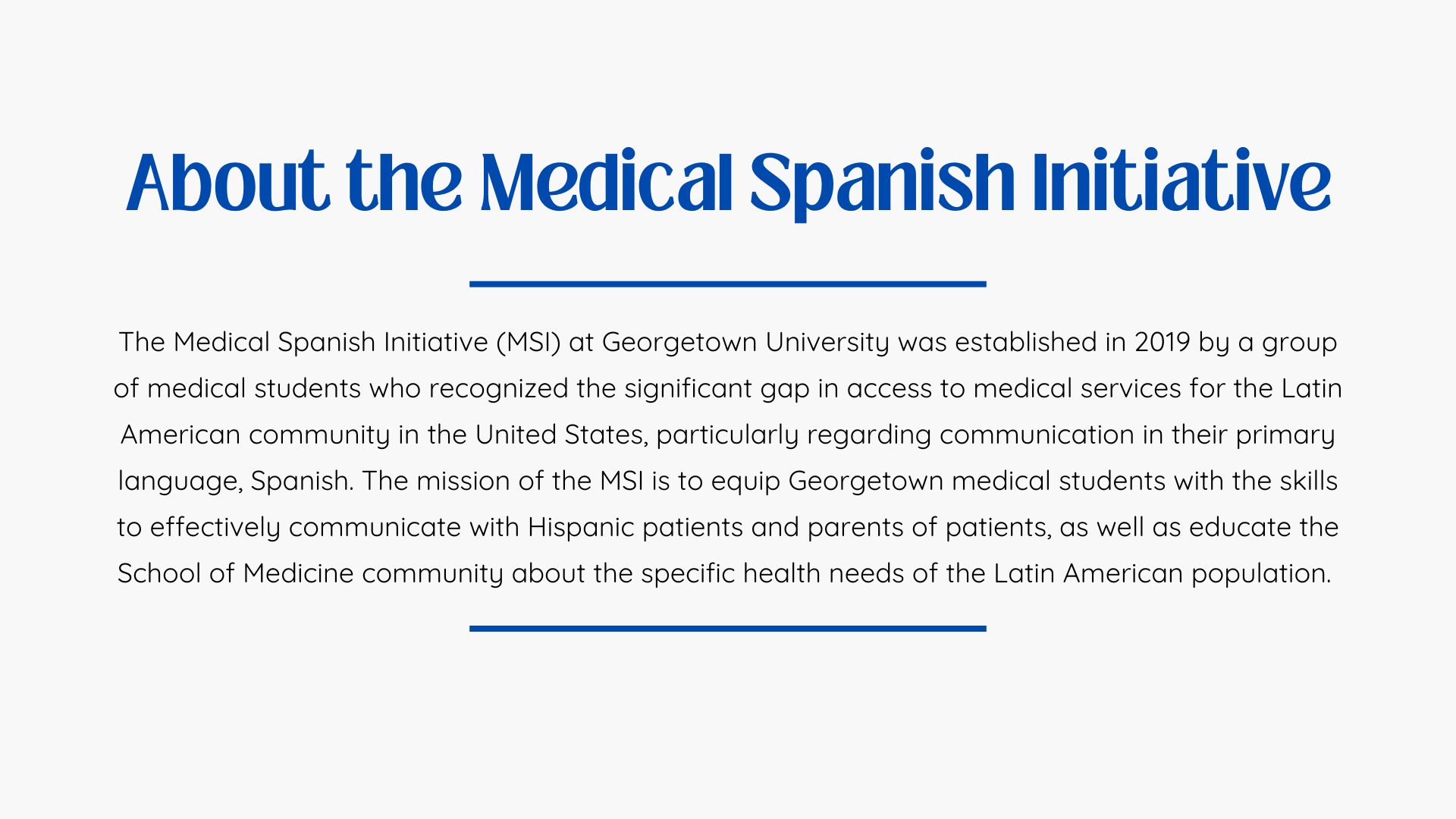 The Medical Spanish Initiative (MSI) at Georgetown University was established in 2019 by a group of medical students who recognized the significant gap in access to medical services for the Latin American community in the United States, particularly regarding communication in their primary language, Spanish. The mission of the MSI is to equip Georgetown medical students with the skills to effectively communicate with Hispanic patients and parents of patients, as well as educate the School of Medicine community about the specific health needs of the Latin American population.